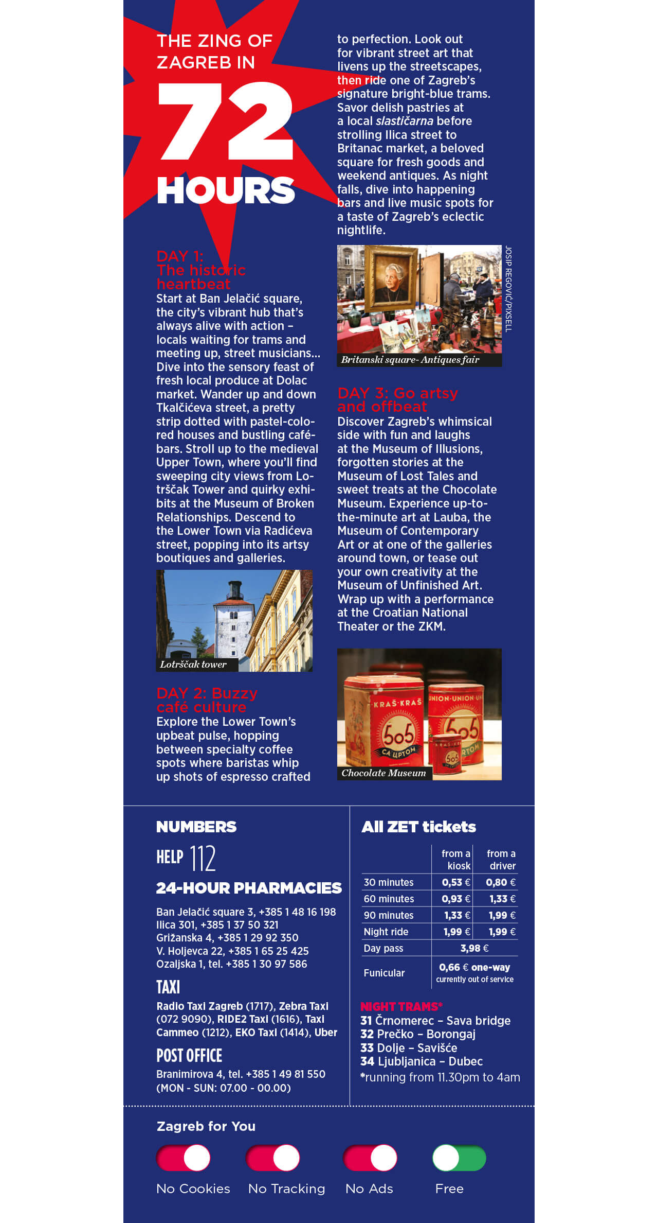 Zagreb is fun. Zagreb is culture. Zagreb are people. Zagreb For You is a newspaper for everybody in Zagreb, both visitors and locals. Published every month, in English and Croatian. Free of charge, always and everywhere, on the city streets and online. Have fun!