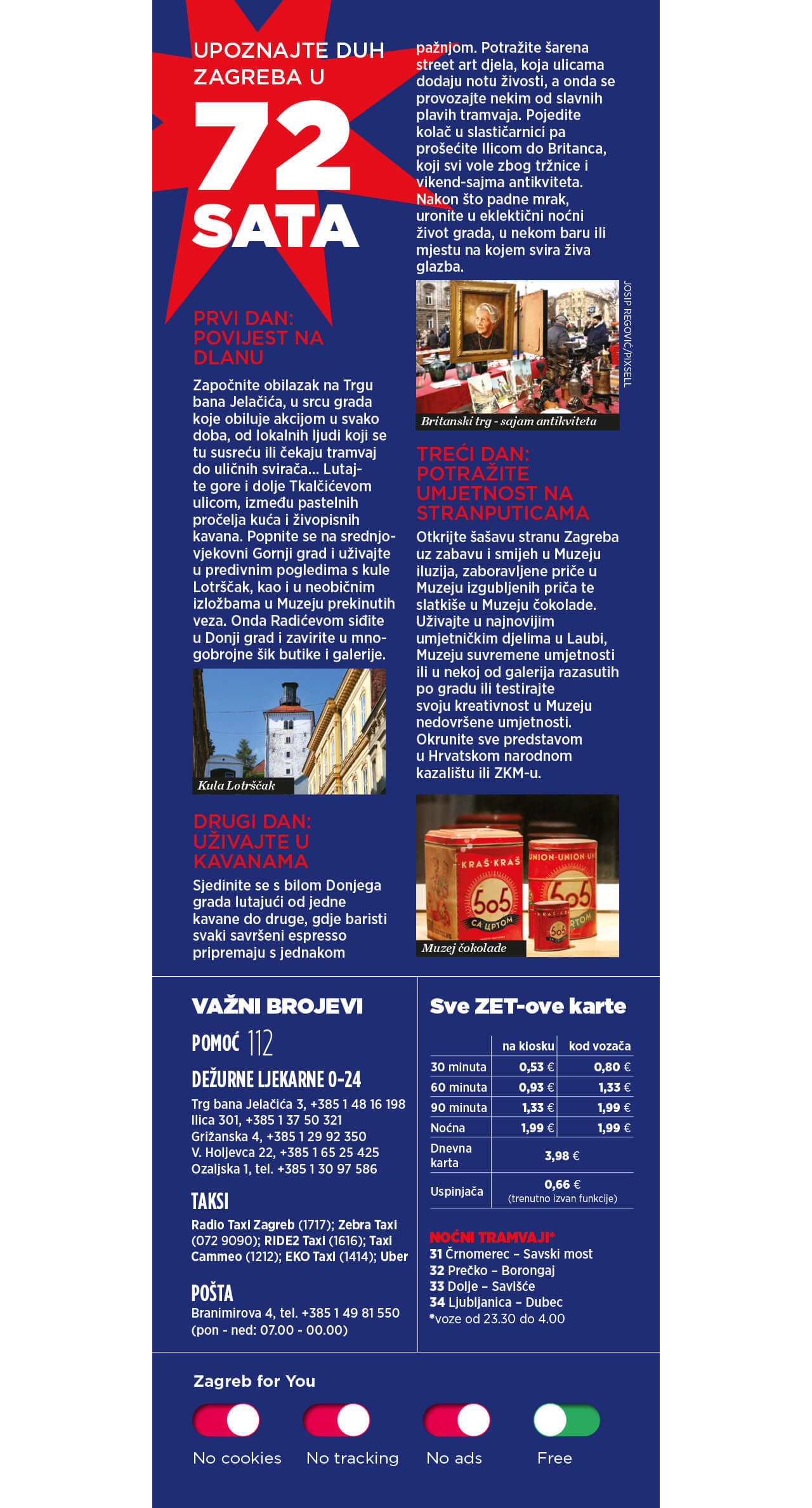 Zagreb je zabava. Zagreb je kultura. Zagreb su ljudi. Zagreb For You su novine za sve koji uživaju u Zagrebu. Izlaze početkom mjeseca, na engleskom i hrvatskom jeziku. Besplatne uvijek i svuda, po gradu i na internetu. Zabavite se!